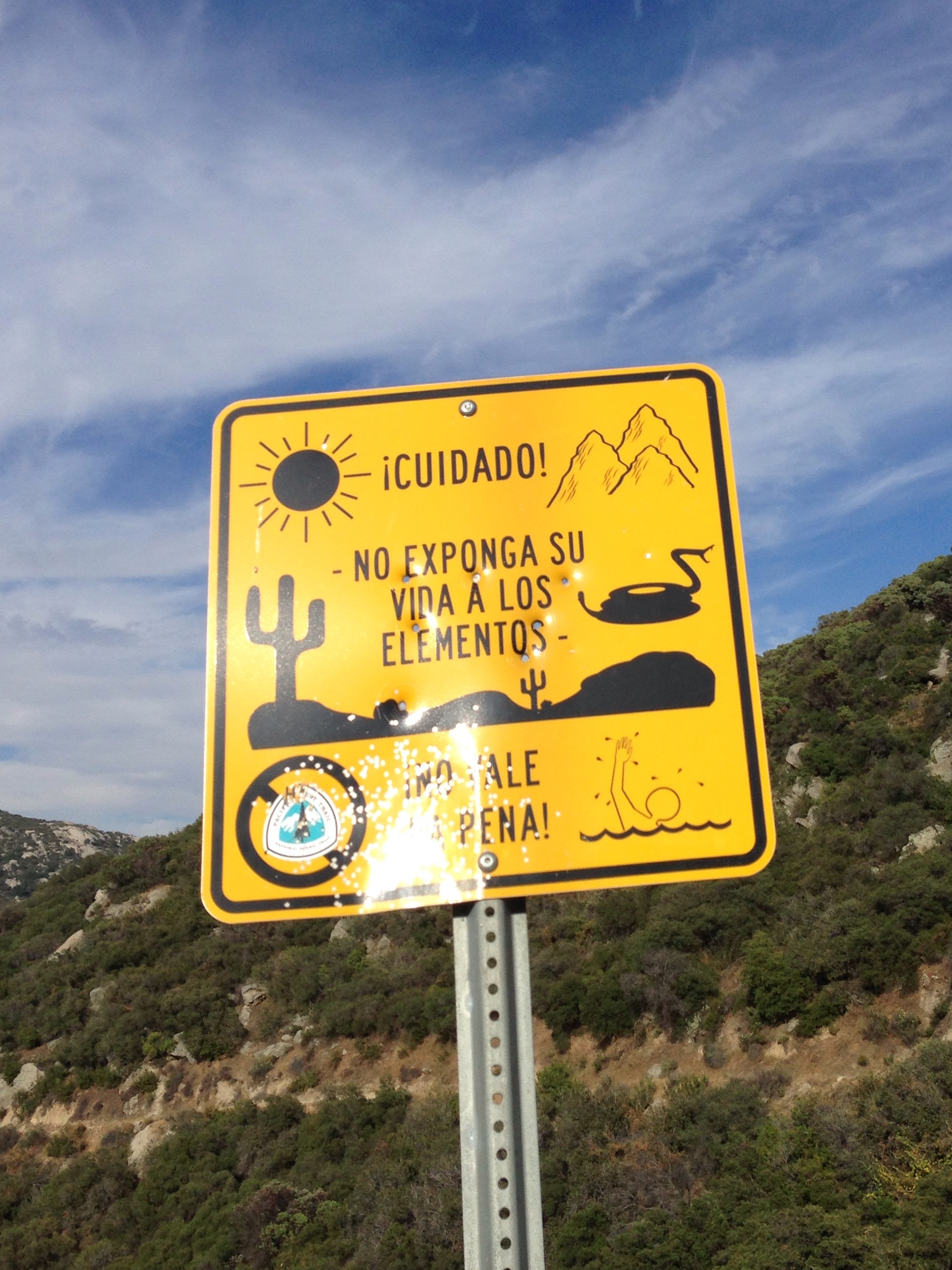 I’m all cozy in my tent with tired feet. Border patrol helicopters are making regular passes over camp at Hauser Creek, a reminder that not all walk these paths equally. A sign a mile backed warned, in Spanish only, of the dangers to be found in the desert: unforgiving heat, snakes, and strangely drowning though I pass nothing but dry creek beds choked with poison oak today.