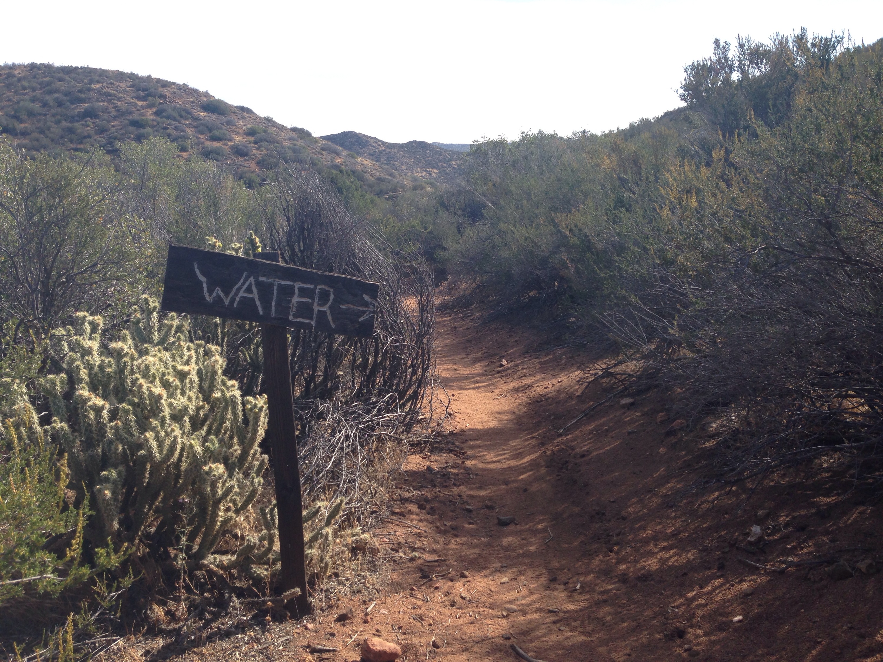 In this long dry stretch everything is organized around water. The famous Third Gate Cache breaks what is otherwise an dangerously dry stretch. Though we have been told that it is stocked, I think everyone is relieved to see it is true. A wooden sign points the way, and down a trail sit fresh gallon jugs, piled up and shaded from the sun. There are signs hanging from the bushes with all kinds of instructions from order to use them, to how to crush and store the empties.