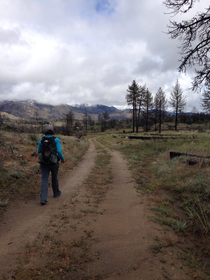We have the view of snowy peaks, where the PCT used to run before the fire in 2013, all to ourselves. Not a soul is out here walking a detour in a break from the storm. Even these roads pass through the burn area, with charred trunks and stumps and barren twisted skeletons of manzanita that are not longer.