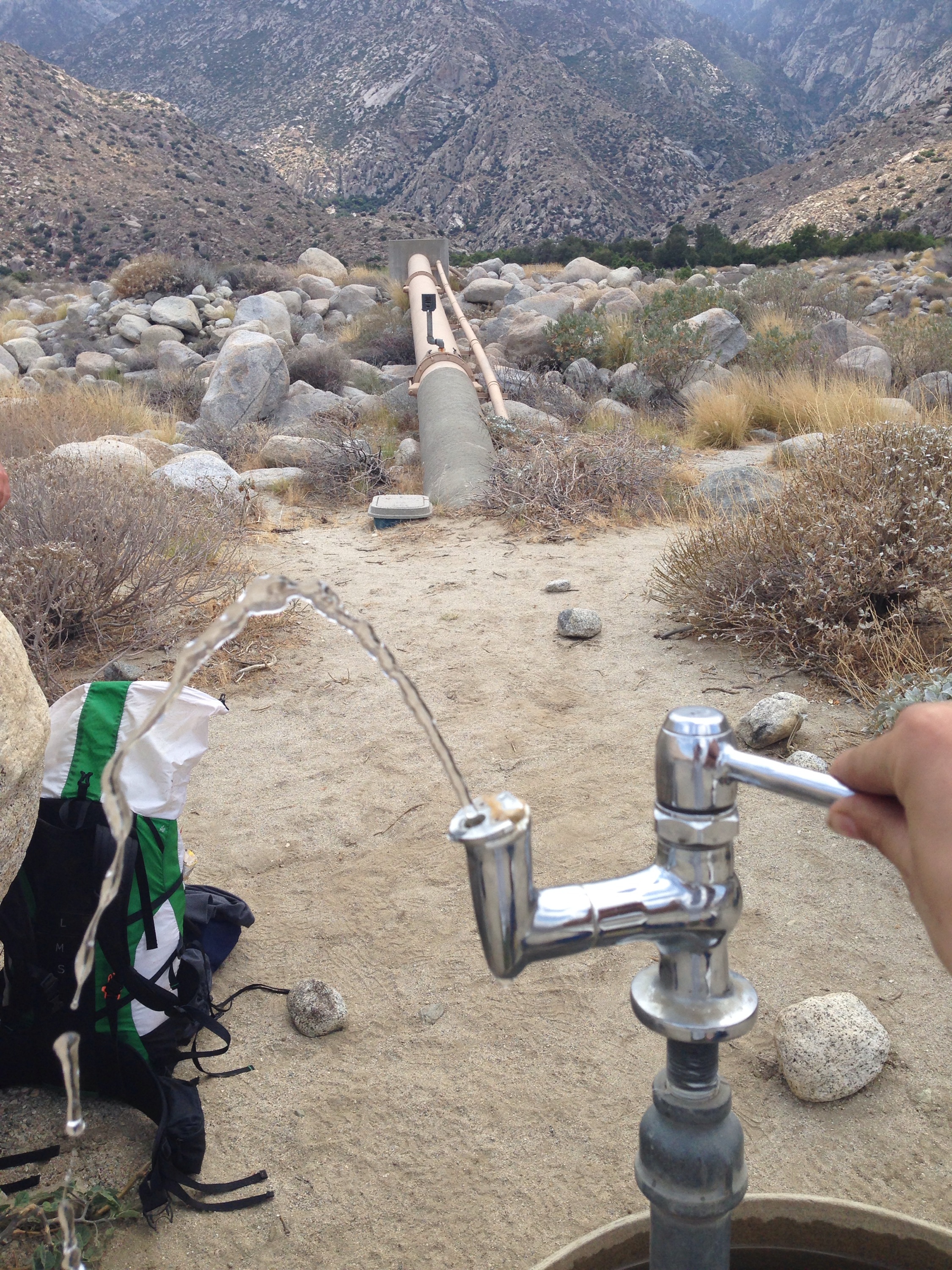 The water source, finally , with its usual cluster of hikers. A water fountain sprouting right out of a large pipe. Filling bottles from its watery arc is comical, especially in the wind. A few hikers comment that it is wasteful, watching the spray miss their containers. But perhaps it is a calculated inconvenience, ensuring we not take any more than we need.