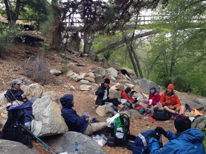 We walk together, four of us now, with Shenanigans not far behind. Hiker train! I yell, and Bad Camper answers with a loud “choochoo.” The trail criss crosses the creek, and we ford on rocks. Bad Camper, who is six foot seven, politely waits (and watches with amusement) as Emma and I, who are both much, much shorter, puzzle our way across gaps he made in a single step. Later I count, and figure I take three to four steps for every two of his. It’s like he’s out for a gentle stroll, all doo-da-doo, and I am at a near run, pitterpatterpitterpatter.