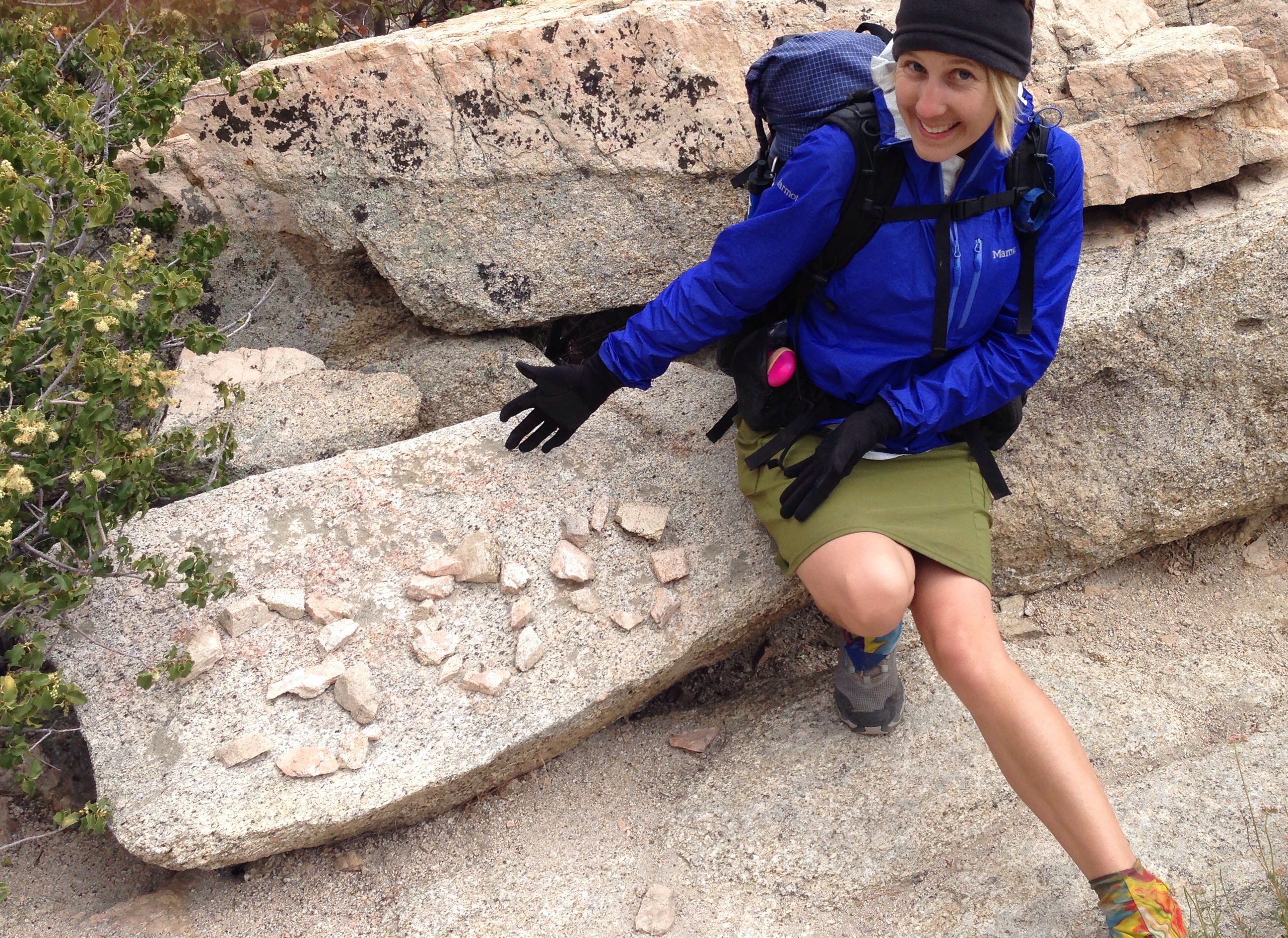 Soon my quiet descent is interrupted by laughter. Nic and Bad Camper are just up ahead and so is Emma, laughing to the point of tears. She had just been rescued from walking the road by mistake called over to the trail. She’s also had very little sleep, after a rough night’s struggle with a new tarp. She shows us pictures on her phone, a yellow swath of fabric that is supposed to be her shelter, all twisted on the ground to the side of the bivy. Clearly the tarp won.