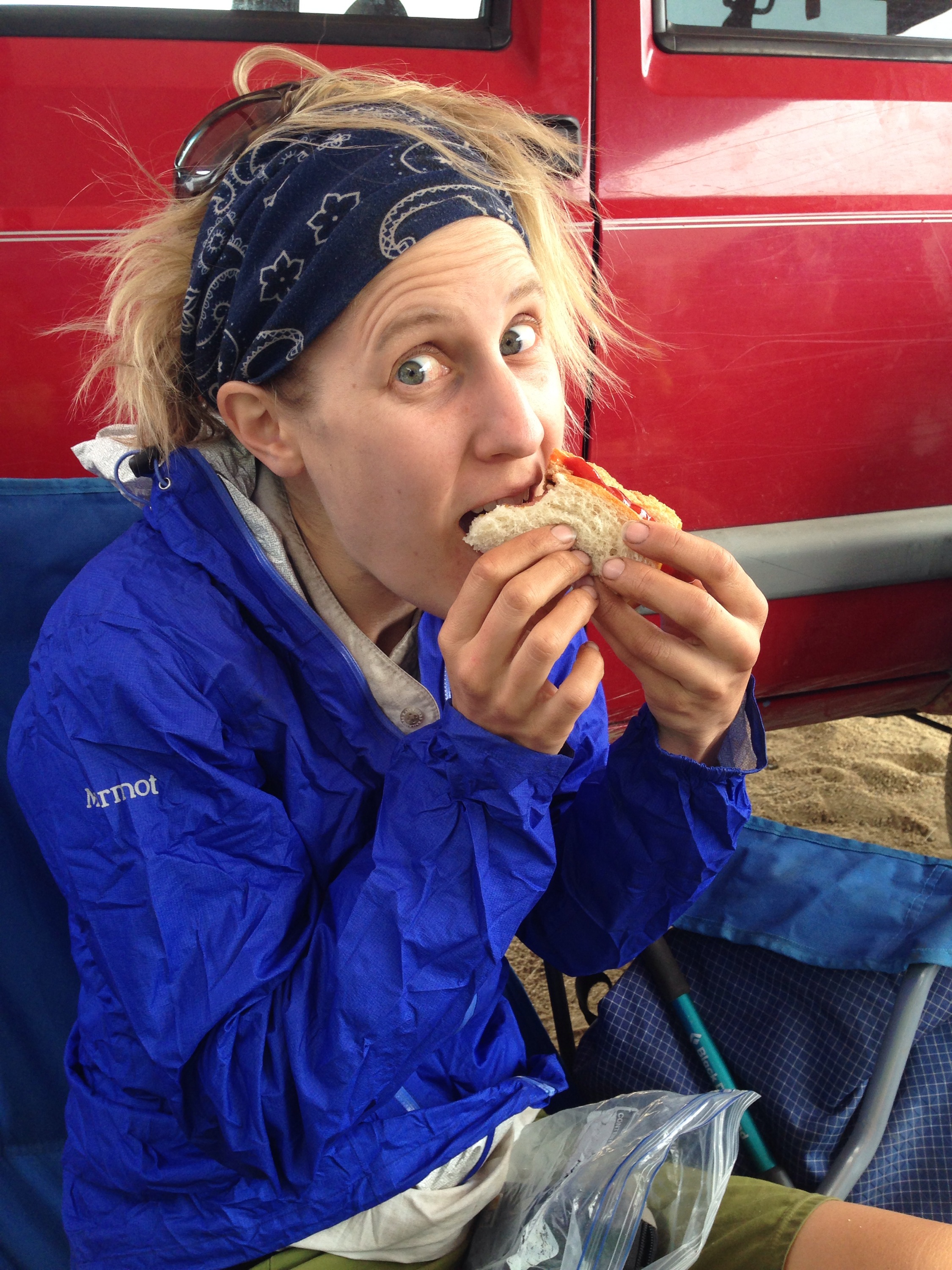 Jetta Blue’s son Jugz is at the road as promised with water, but also a trail magic accompaniment to resupply for Coyote and Happy Feet. Beer and soda and carrots and grapes. And grilled hot dogs on white bread with all the fixings. I eat one. It tastes like childhood. I go back to vegan food and eat peanut butter on wheat tortilla. And then I eat another hot dog.