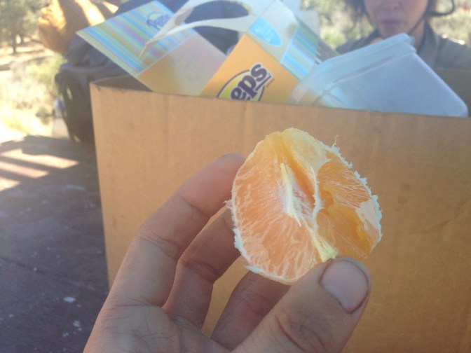 The campground is eerily deserted. It seems like no one else it out here today. Just a hiker box on a picnic table full of the usual dead shoes, empty fuel canisters and dregs of sunscreen. I dig through anyway and am rewarded with am orange, I peel and halve, too good not to share.