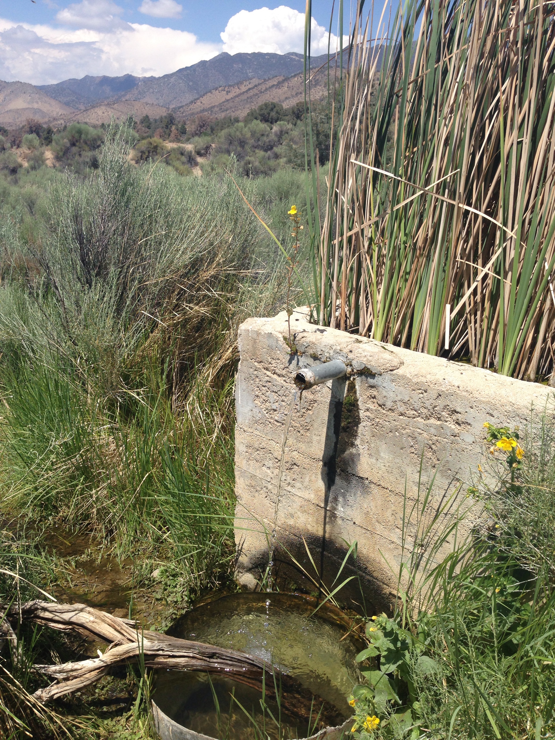 I open a bottle of cache water and it reeks of plastic, having been left in the sun. We renew our efforts to locate the actual water, which is down the road .3 miles. There’s a cinder block trough full of tall cattails and green algae. But clear cool water flows steadily from the side. We fill bottles, wash socks, rinse dusty bodies.