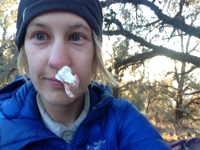 I roll over, sniffle and then feel liquid running down my cheek. Yesterday a tent on the face, today a bleeding nose. Both lovely ways to start the day. Luckily Chef is a quick draw with the tissue.