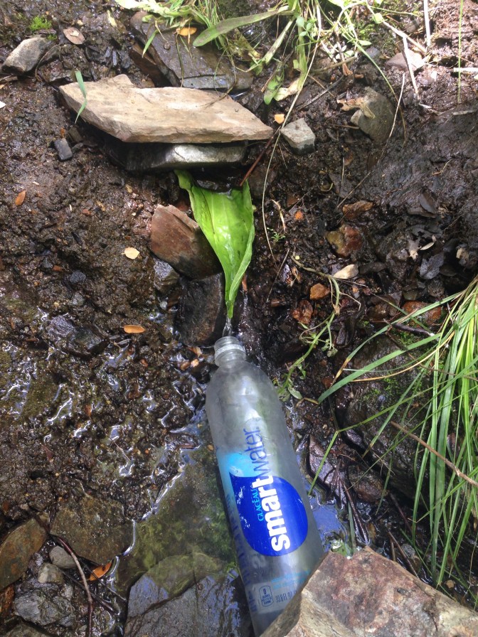There’s also a large bear print beside the trail that I missed. Though I did see more snakes, a very thin one, sage green on top with a shockingly orange belly and tail ring. There’s also a magical spring, where a previous hiker has rigged an adorably genius leaf spout for filling bottles from the shallow trickle.