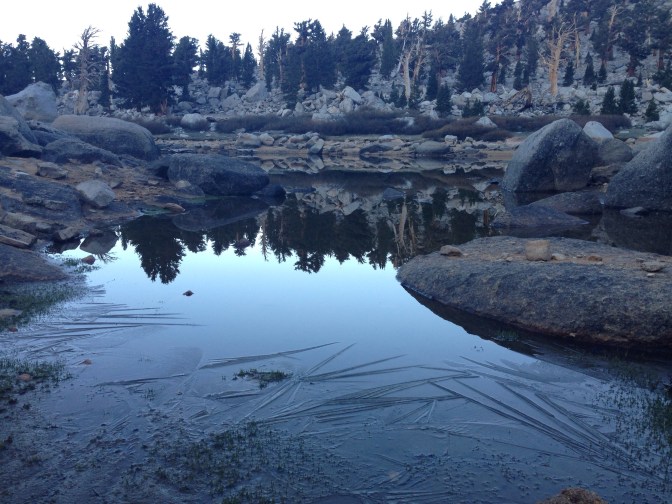 I walk down to the shore to take photos of morning reflections, and see shards of ice. Crunchberry confirms, it is still only 30 degrees way up here above 11,000 feet. Sleeping with my pillow stuff sack filled with water filter and electronics is justified; batteries are still charged and filter still functional despite the temperature.