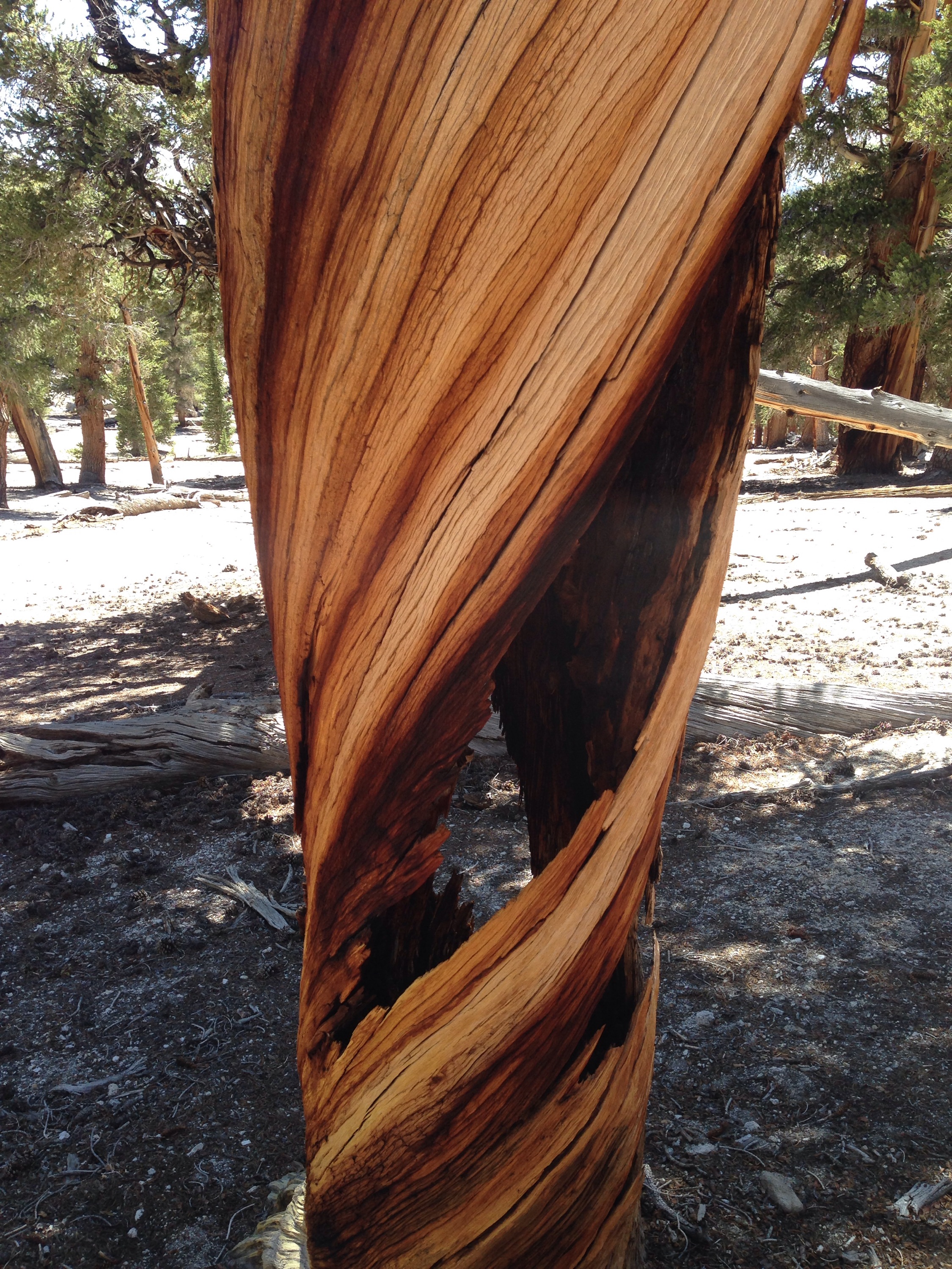Just after 8am, the sun reaches over the ridge to warm my tent. I evict myself from my sleeping bag, pack up and start walking. I stop for Lunch at Rock Creek, a fitting end to the water report. The creek bubbles through a too perfect meadow, water clear, cold, abundant. I chat with Waterbed who has joined me for break, as we wait for animals to frolic or even start talking Disney-style. I spend the afternoon walkinh though forests of Foxtail pines, contorted by the harshness of their high home. Red trunks are twisted, three-quarters dead and yet alive. One impossibly resilient tree is burnt and twisted with a hole straight through, still supporting green branches.