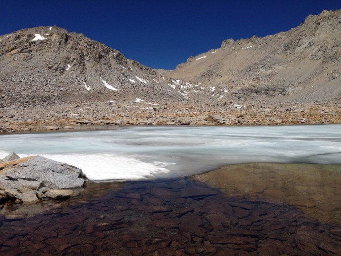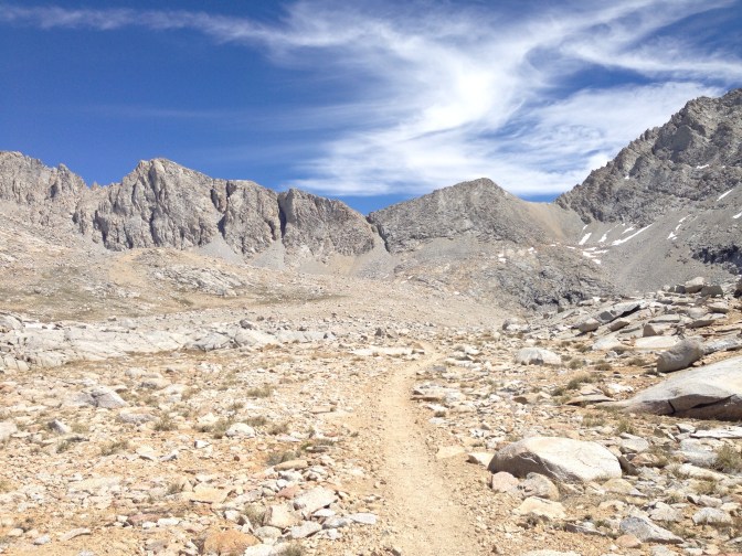 I look back on the valley of the morning’s progress. Even though I was just through here nine months ago, the trail today is still overwhelmingly stunning. The snow-streaks emphasizing the folds of mountains near and far. Further back, Bighorn Plateau where I contemplated morning reflections on the pond as as deer grazed peacefully beside the trail. And further still, Whitney, where friends should be right now at the summit.