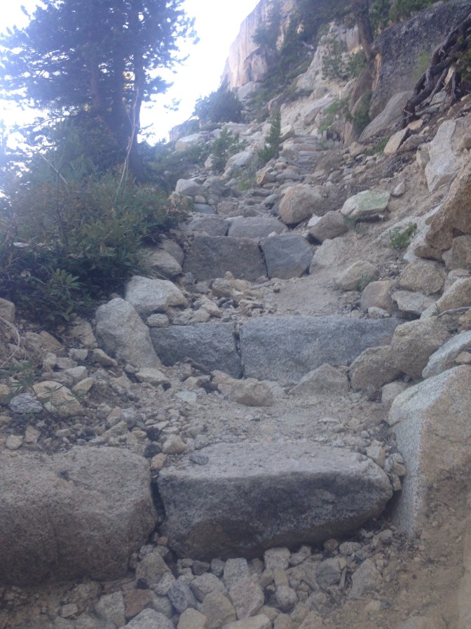 After a rest by the creek, I begin the third and longest climb of the day. Three thousand feet up and over Silver pass, much of the trail a massive stairway to the sky, giant stone steps I remember as waist high. I make the seven miles fueled by a single pack of caffeinated honey stinger jellies, the stairs not quite as big as remembered, though definitely as many.