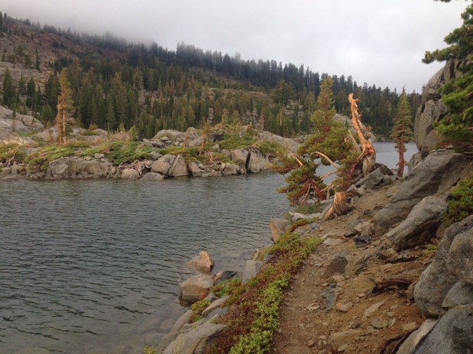 I leapfrog all afternoon with Angler and Cheese, but we have landed together at a lake outlet for the night Thick clouds continue to spill over the ridge. Though the sky spits rain on and off, the thunderstorms fail to manifest. It might be cold and damp, but at least I was able to walk over a pass not worrying about being struck dead. With all the grey cloud and granite, dark green vegetation with hints of orange, the shore reminds me of the coast of southern BC. Tomorrow is supposed to clear, finally an extended interruption of the storm pattern.