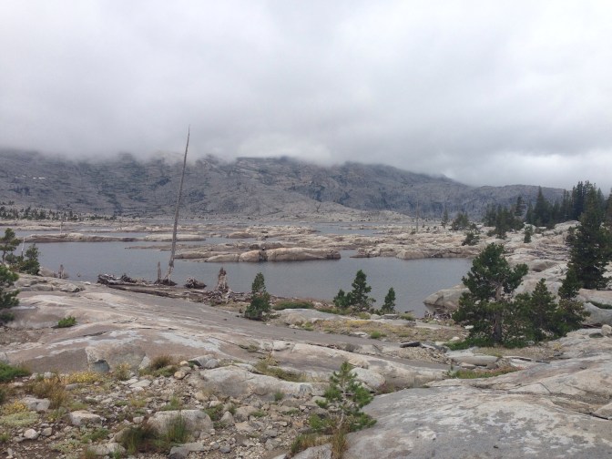 I leapfrog all afternoon with Angler and Cheese, but we have landed together at a lake outlet for the night Thick clouds continue to spill over the ridge. Though the sky spits rain on and off, the thunderstorms fail to manifest. It might be cold and damp, but at least I was able to walk over a pass not worrying about being struck dead. With all the grey cloud and granite, dark green vegetation with hints of orange, the shore reminds me of the coast of southern BC. Tomorrow is supposed to clear, finally an extended interruption of the storm pattern.