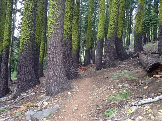 The clouds are grey and dark, despite promises of fairer weather. Just before Squaw Valley, I ask a weekend hiker, one of a pair heading south, if he’s from around here, eager for an experienced evaluation of the misbehaving sky. I have also been asking people if they are locals lately in hopes of figuring out if there’s a way to leave the trail a day or two after Sierra City, since I have some extra time until Stephen arrives and would like to fill it with more miles. One topic leads to another: weather, the town of Quincy, my new postdoc as reason for taking leave, water politics. And then, in an offer I still cannot quite believe, the man, whose name is John, says he has a house in Sierra City. I can stay at his place if I would like and gives me the details for finding both house and key. He does not even know my name, trail or otherwise. This act of trust overwhelms lingering grumpiness from yesterday’s unpleasant encounter. And to put a high-fructose corn-syrupy square of cherry goodness on top, Cheese walks up with a big grin “I have trail magic for you,” he explains, pulling a full size pack of Starburst from his pocket. A woman was handing out candy to thru-hikers a ways back and he asked if he could take one for me too. “I thought I’d catch you sooner,” says Cheese.