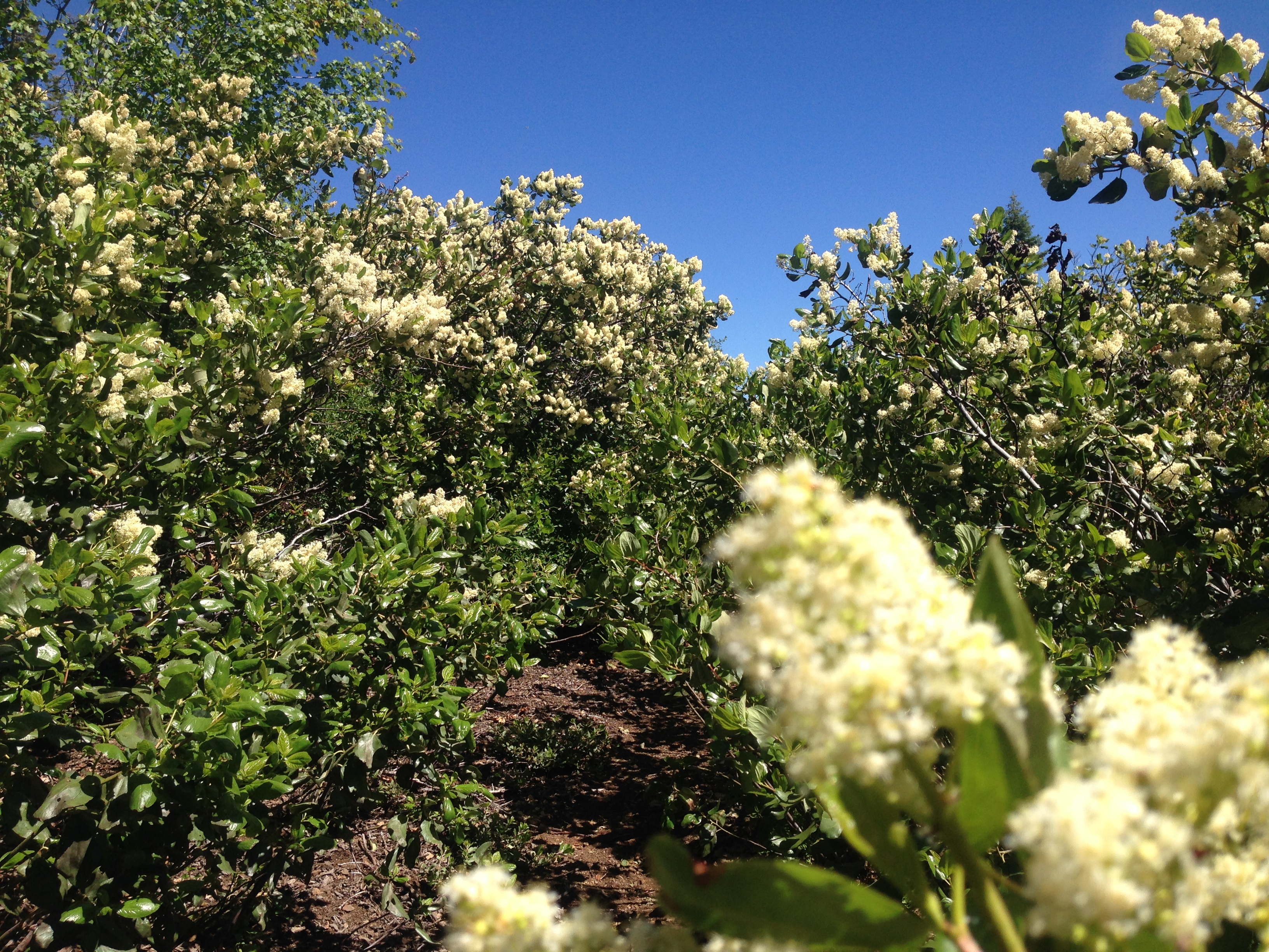 The trail is a narrow ribbon today, so overgrown you’d never think it was the PCT. I wade through ferns, push aside maples, and tunnel through thickets of flowering shrubs humming with insect activities.