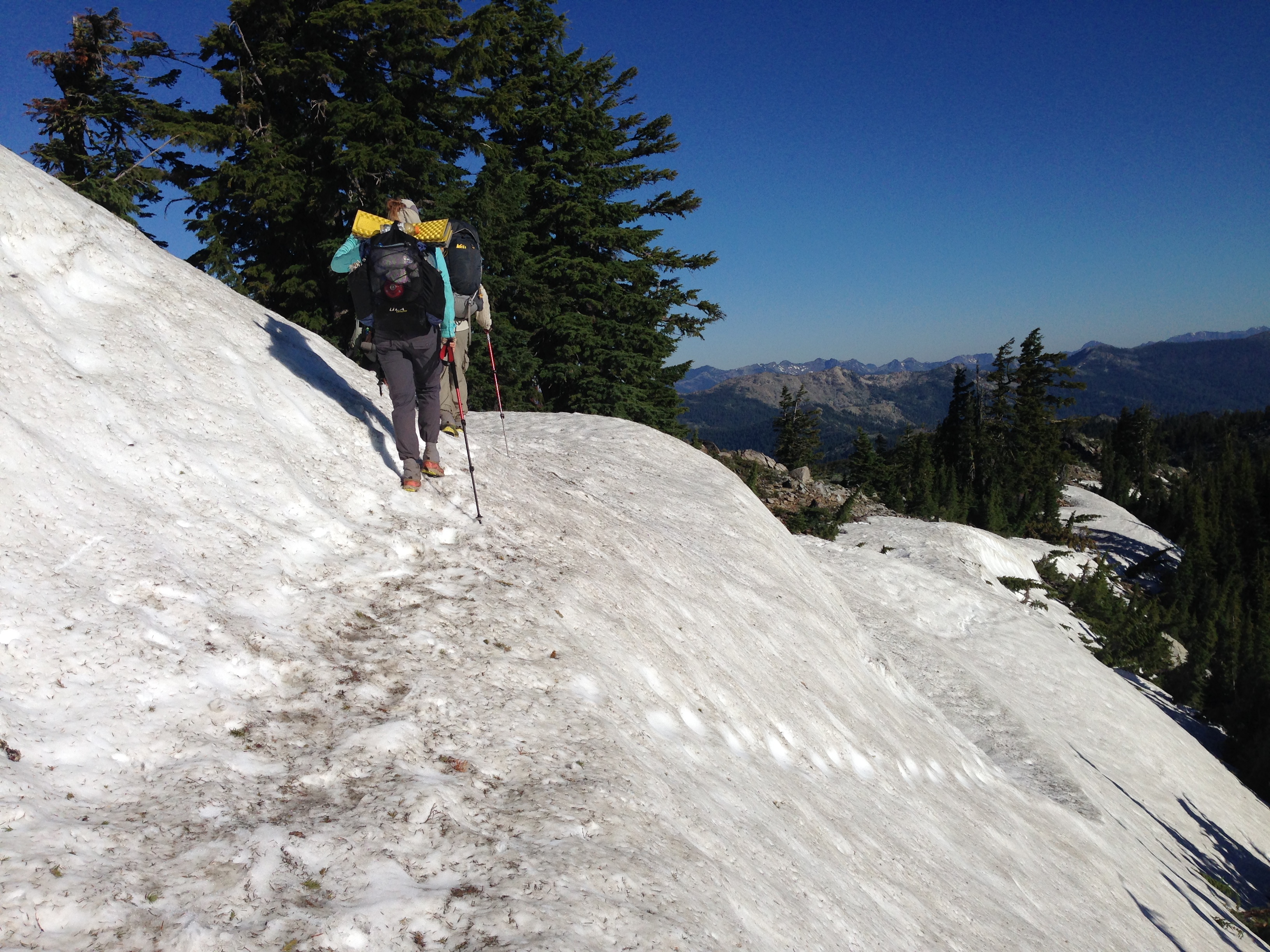 We make it across all in one piece, not panicking and with no major slip ups (or downs). And so we stand on the last flat bit of snow like brave conquerors and take celebratory photos only to watch a new-to-us thru hiker power across in worn trail runners as if the snow wasn’t there at all. “He’s just walking in our steps,” we console ourselves.