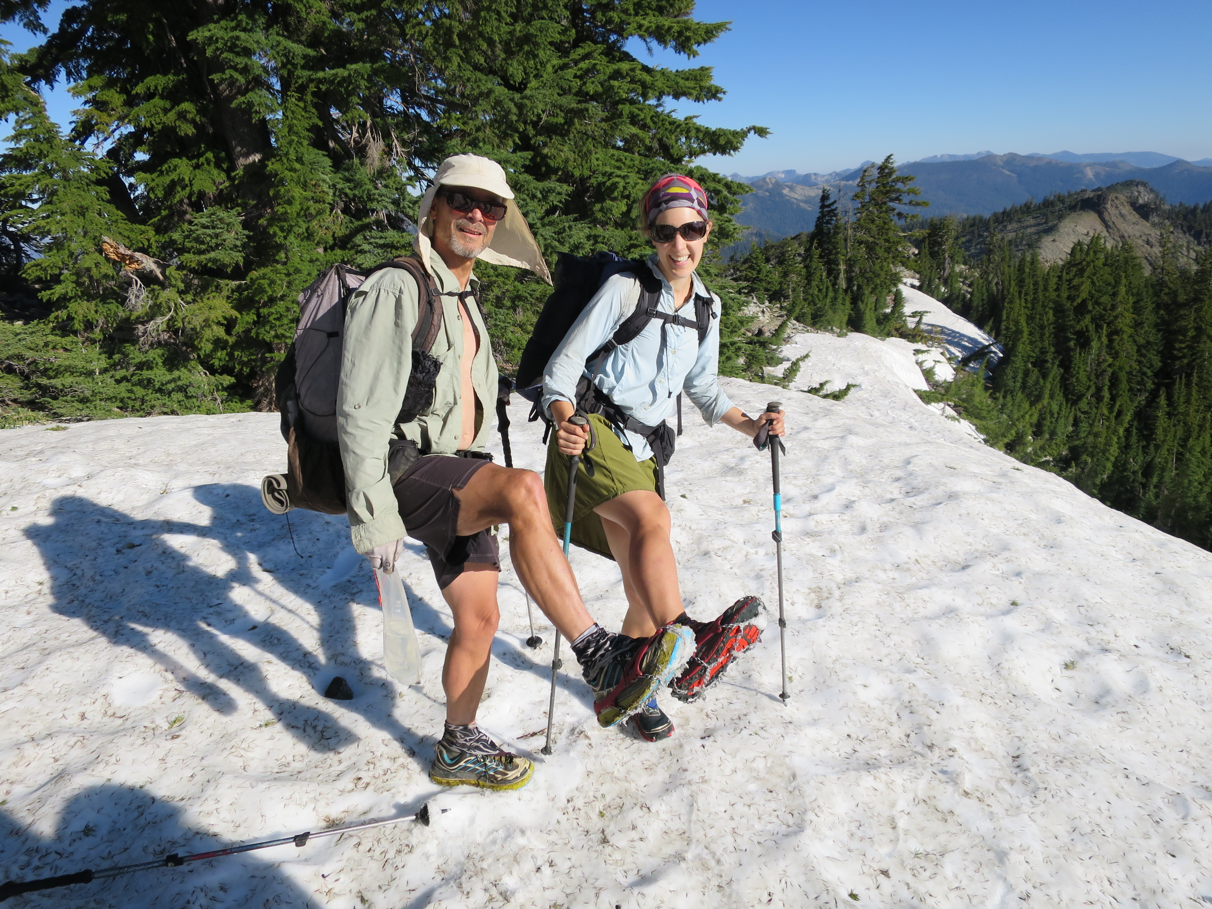 We are all up and on the trail by 6:30 am, on the hiker train headed for Etna. There’s a hill up, and all is looking good until we finally hit The Snow. The scary stuff. And with only one pair of microspikes between the four of us.