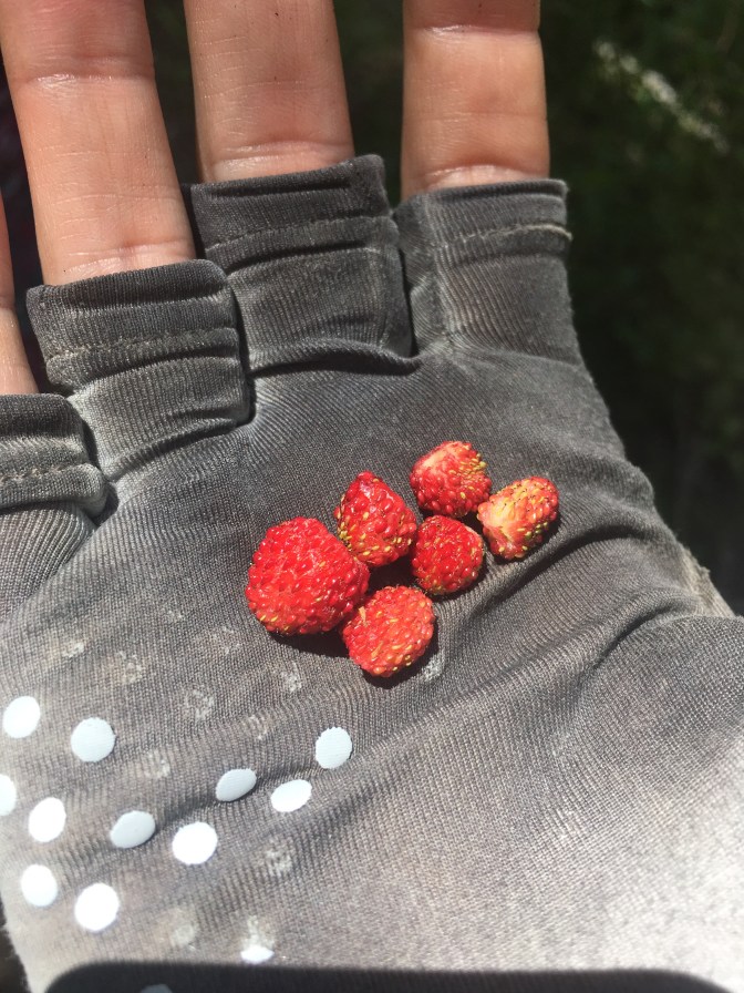 But soon the road ends for us and while the single track finally feels like hiking the way is mostly up. I distract myself with all the pretty flowers and plants along the way. Some familiar, like sky rocket. Some I only know from photos, like Colorado columbine. Which is much bigger than I expected in real life. And some, I have never seen before. There are delicious surprises too, in the form of tiny wild strawberries. I perform a unintended thigh workout, via a series of strawberry picking squats with fully loaded pack.