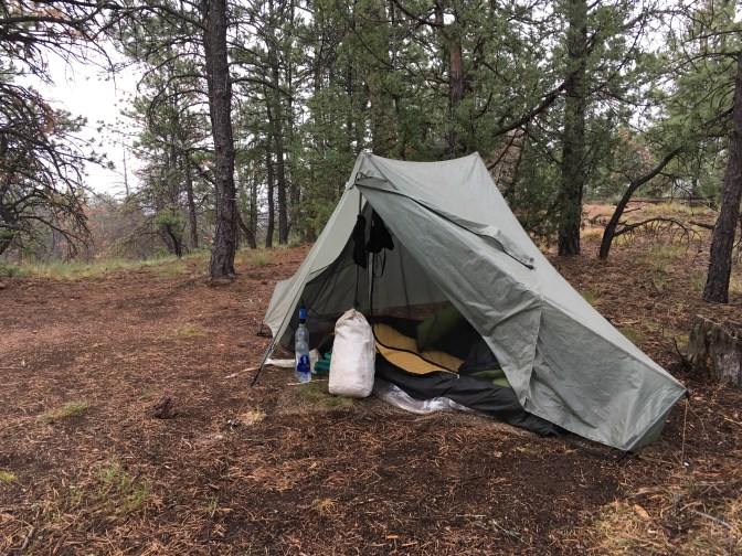 On we walk, taking note of which seasonal streams are still running (all the ones the guidebook awards the cup half full symbol, though some will soon be dry). But now we are camped at least partway up the giant hill. There are four other tents already here, just a hare before the end of segment 3.