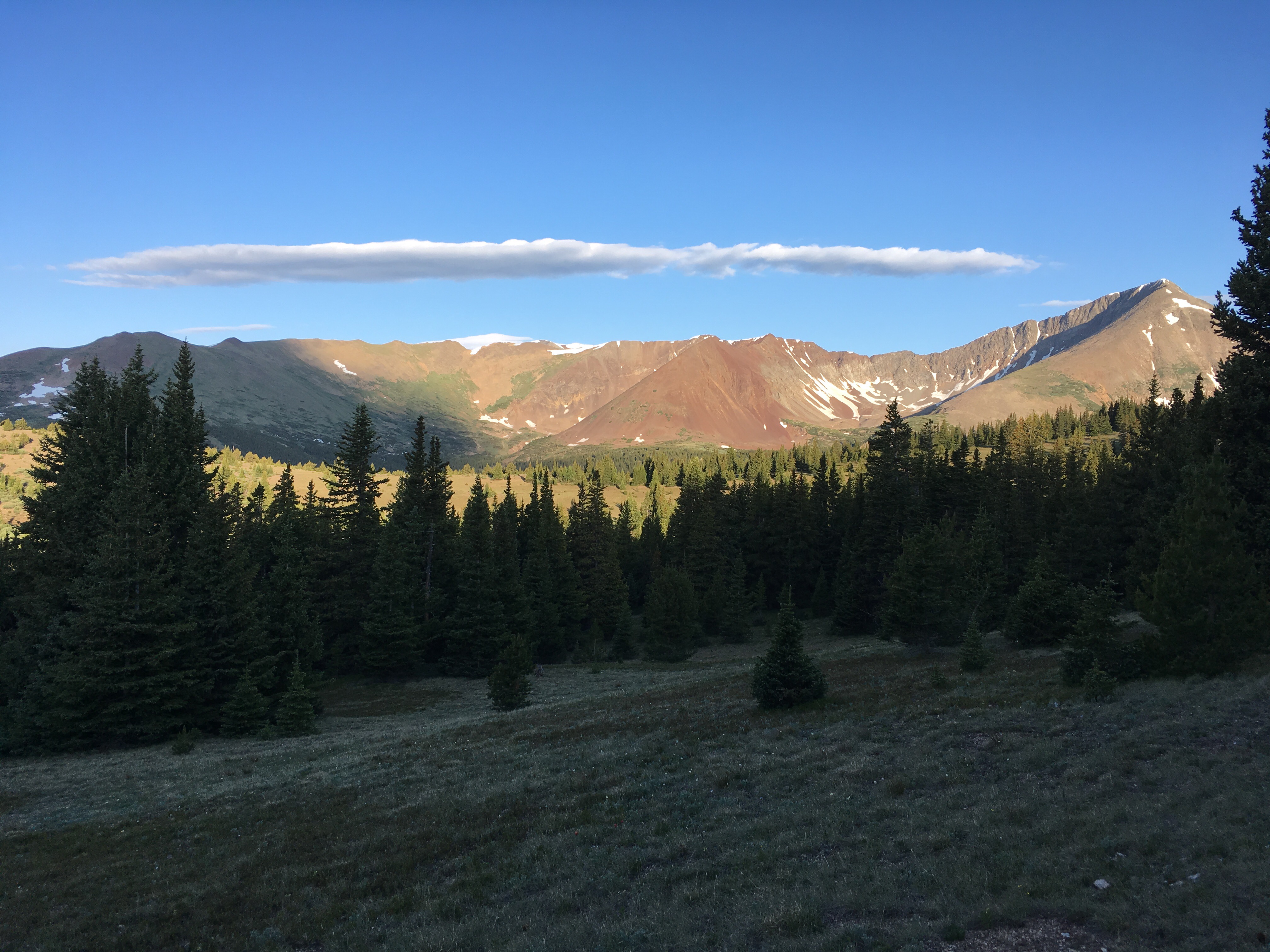 A quarter of the way up and my relatively empty pack seems full of rocks, my legs are lead. Even the metaphors are hard. At one point the long switchbacks angle just right to make it feel as if we are walking uphill toward the pass again! Then the rain falls in fat drops just insistently enough to require repacking my pack. And then stops 2 minutes later. The weather in these Colorado mountains goes from sweaty hot to shivering cold in a single puff of cloud.