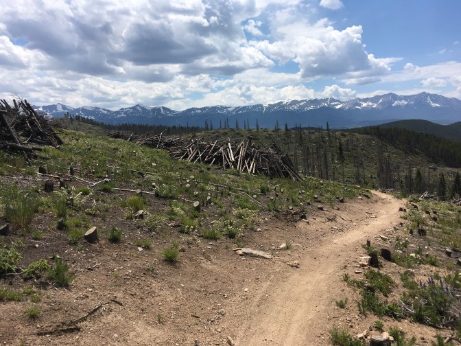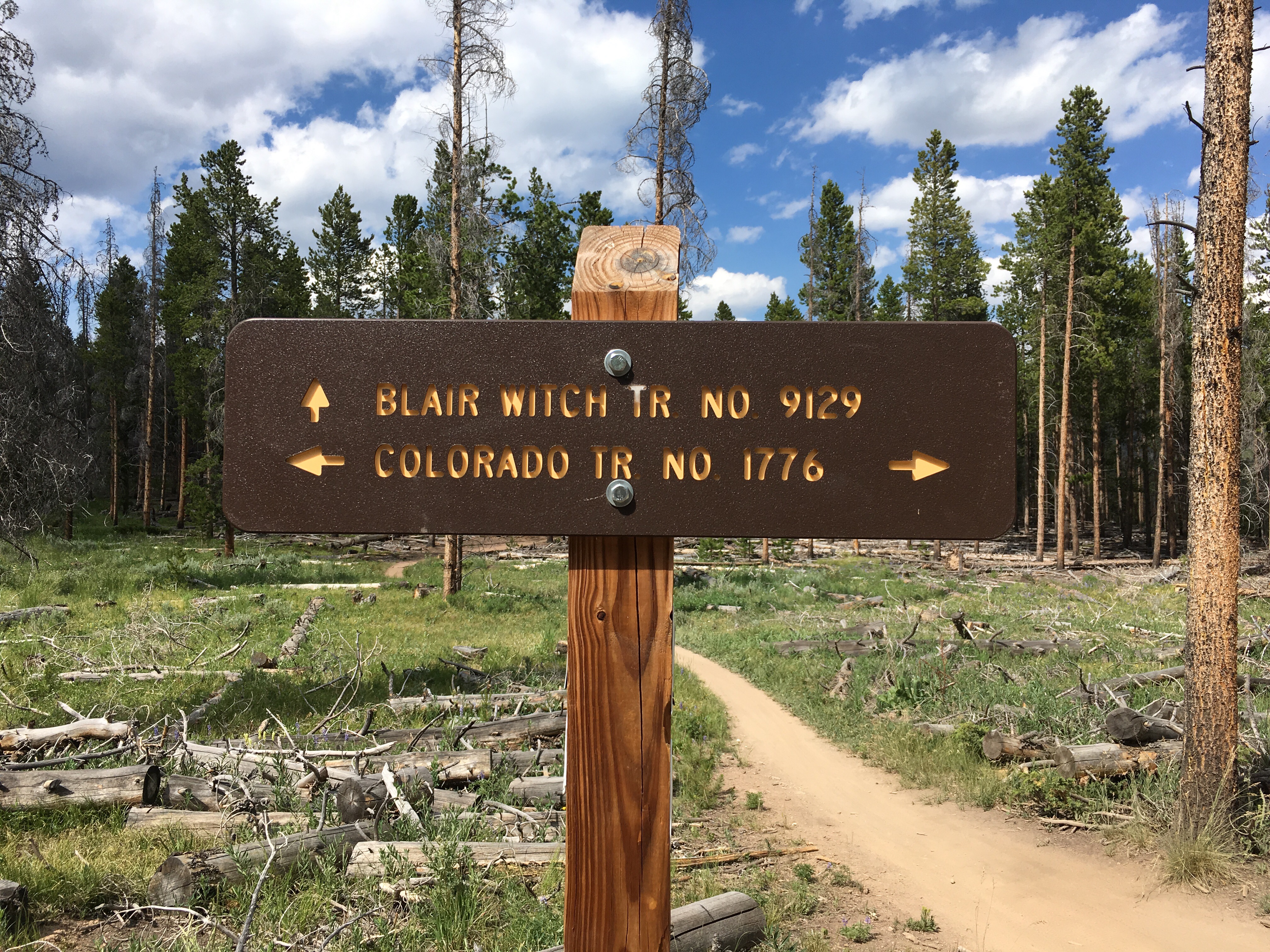 Finally I have LTE phone service and can check on possible rooms for tonight. We have reservations for tomorrow but have arrived a day early on a busy weekend. If the bikers are any indication town must be packed. And Sour Patch has zoomed ahead so now we are only splitting 2 ways. It seems the whole town is booked up for the holiday, or at least the bits of town that can be yours for under $300 a night. What to do? We are only 7.2 miles from the road and it’s not even 2pm. The only other option seems to be camping at the last sites before town which appear to be under the power lines. In beetle kill forest. By the Blair Witch trail?!?!