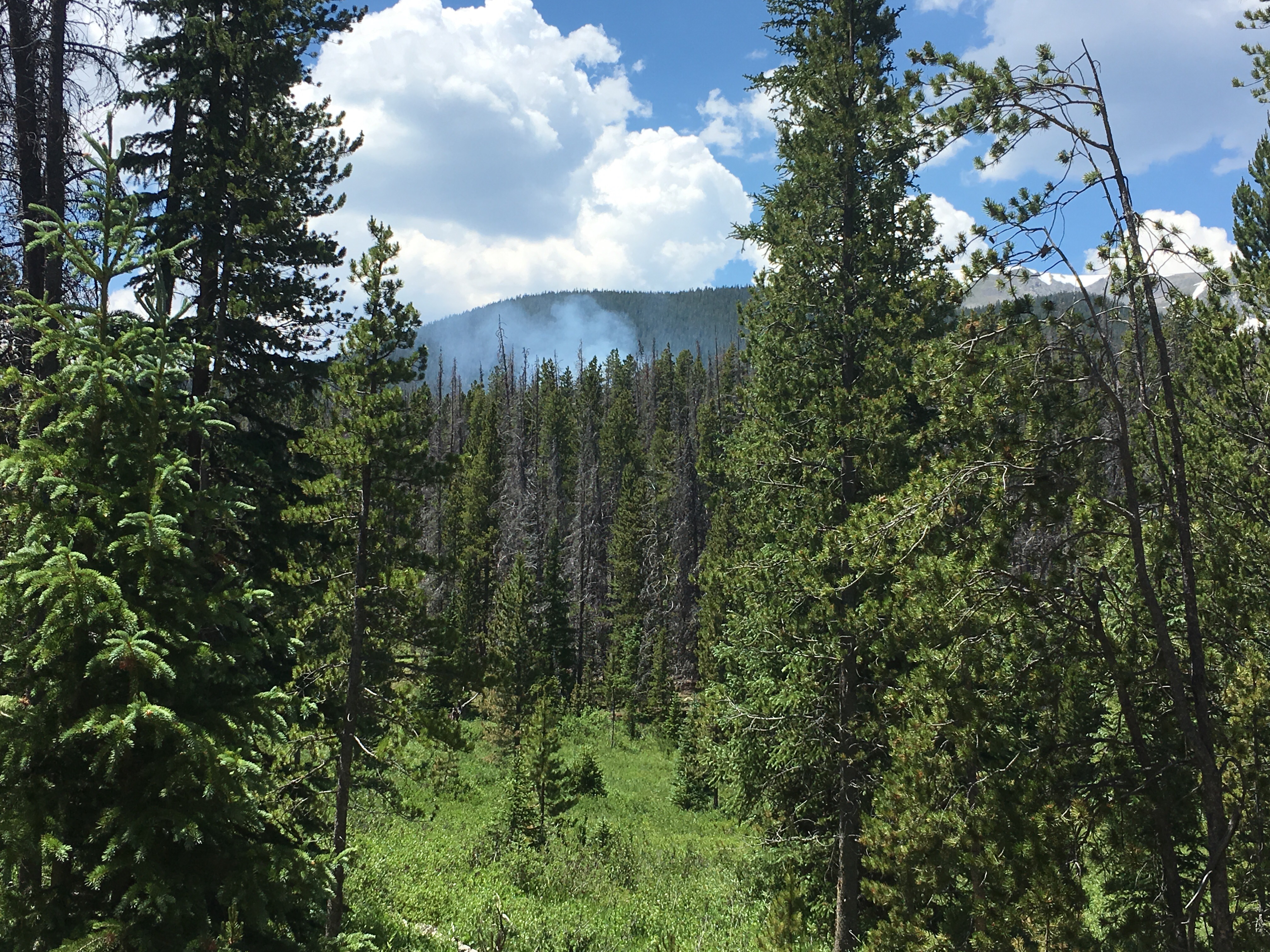 I mull over the conditions: beetle kill trees down every where, tinder dry conditions and it’s the hottest day of the year so far. Plus the trail goes above the fire (fires move fastest uphill) and the wind, which always seems to pick up in the afternoon could change things rapidly.