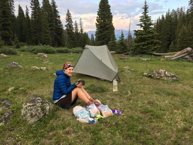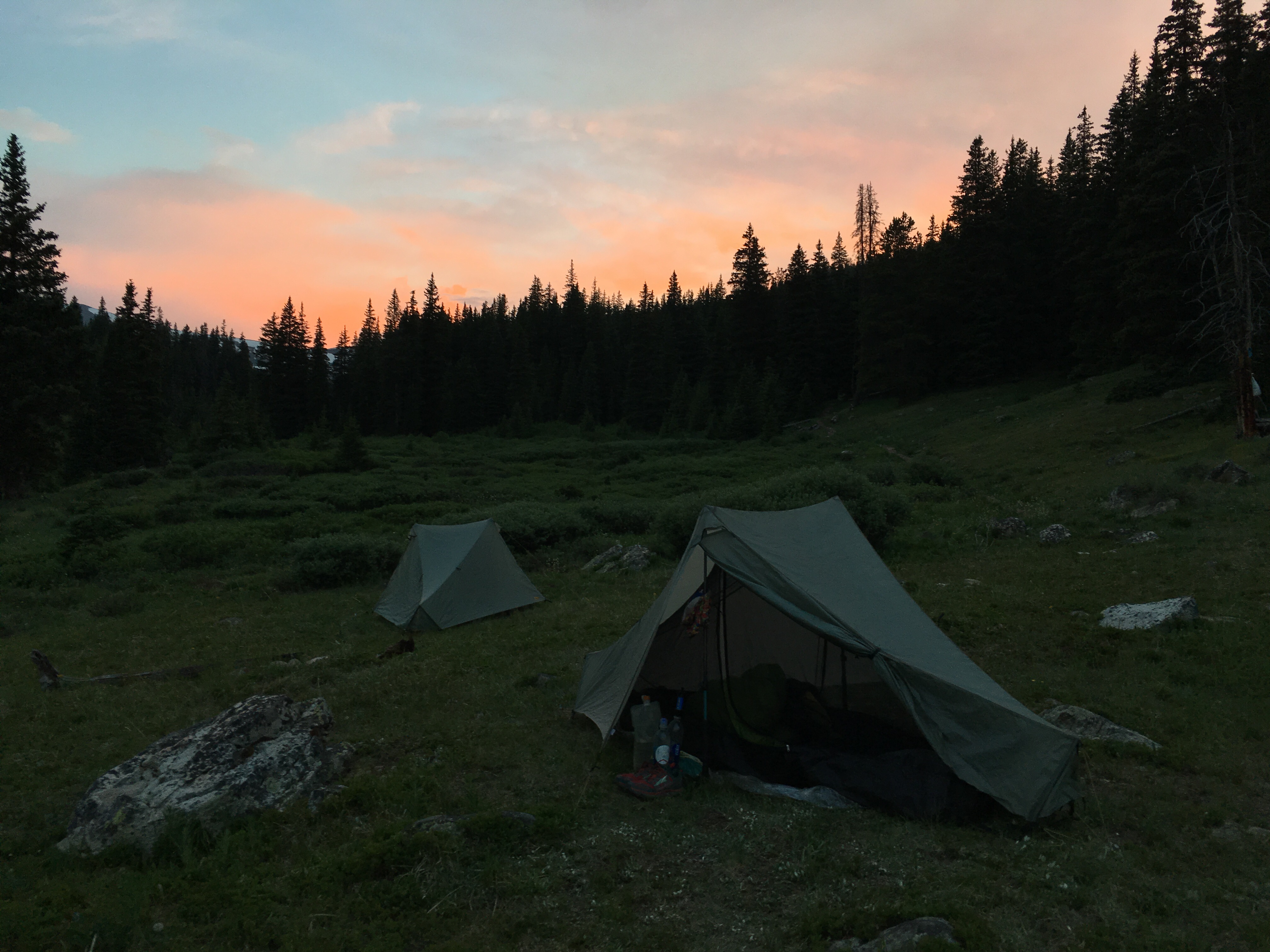 We end up camped on the pretty meadow and I feel kind of terrible squishing a few plants, but the more durable sites are taken and there are fire pits here and the grey remains of an old log cabin. Though there’s absolutely no way I’m lighting anything other than my stove tonight. The thunder clouds have thinned to wisps (smoke?) pink with sunset. And the almost full moon rises above the red hillside as the alpenglow glow fades into night.