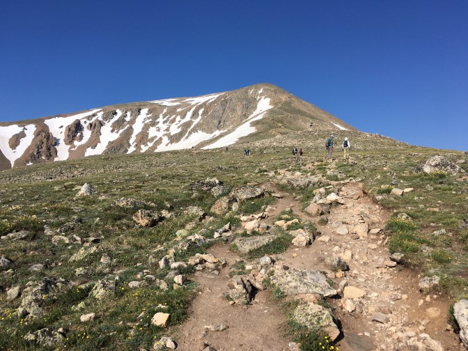 But today I get a chance at a 14er (14,000 foot peak) redemption. I wake in the almost dark, with the mountain looming more than 4,000 feet above. The trick in Colorado is to make it up and off the summit before a thunderstorm rolls in. This is usually around noon, but a man on the way up tells me the storms are predicted to be ahead of schedule today. Well. At least I got started before sunrise.
