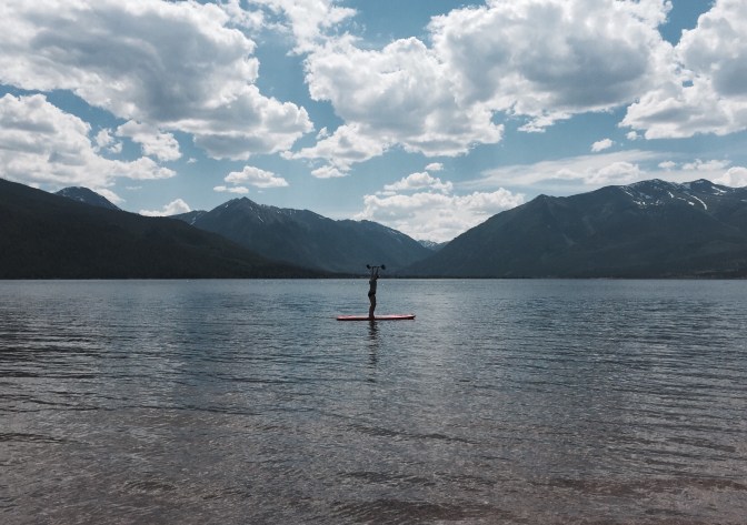 A few miles in, I’m feeling woozy from the heat, and spy a stand up paddle boarder gliding peacefully out on the lake. Am I hallucinating? But then there’s a side trail to a sandy bit of beach between the reeds and a family is there playing in the water. I drop my pack, offer “smiles not miles as explanation,” and dive into instant relief from overheating. We sit on the beach, chatting with the family, and, amazingly are offered use of the paddle board if we want to try (!). Of course I say yes and manage a little spin without falling in, massive peaks as backdrop.