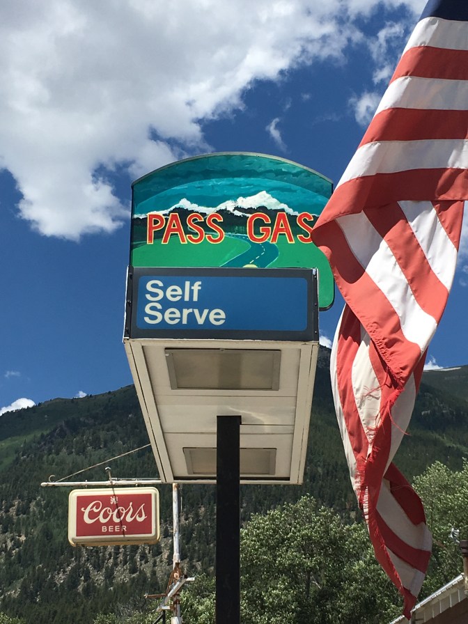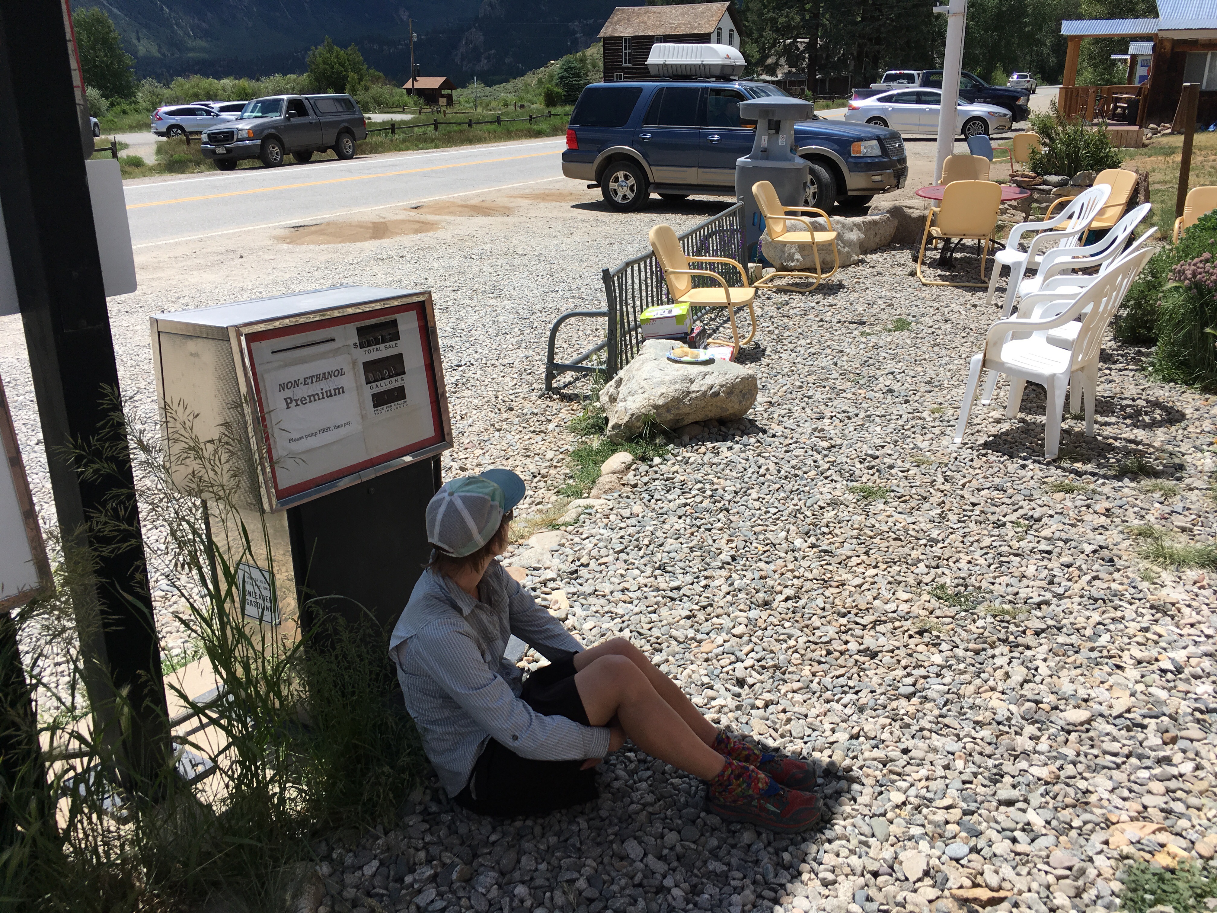 We eat food from the hiker box, roasting in the sun waiting for phones to charge. I chase the shade, settling for a tiny square beside the gas pump, that I only later realize has been hilariously named: