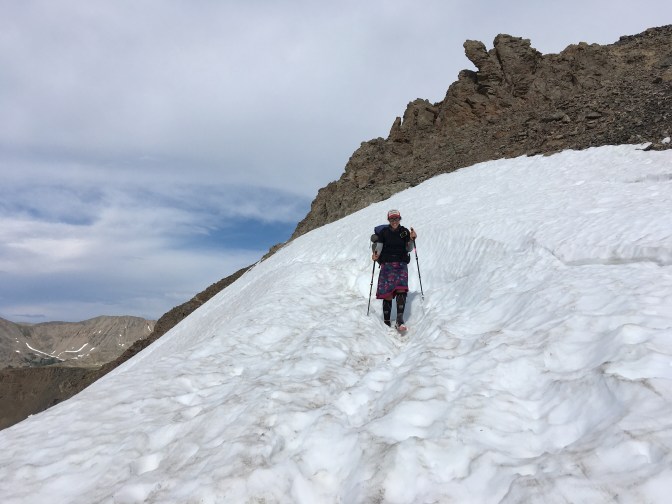Finally, the thunder seems distant enough to pop out above the tree line. I still want to attempt the pass, but am hesitant about the conditions. There’s an optipn to climb around the snow, but surely the rocks are wet and slippery from the rain? And the cliffs look as treacherous as the snow, and for much longer. Just as I really begin to worry about what to do, a CDT hiker comes our way, the first and only person we’ve met whose been over Lake Ann Pass today. He assures us that the snow is soft and sticky and that we will be fine. “But an older CDT hiker told me, one slip and I would die,” counters Steph (true story. He also seemed shocked that she would even attempt such a feat in a skirt). “You won’t slip” assures the CDT hiker and that is that.