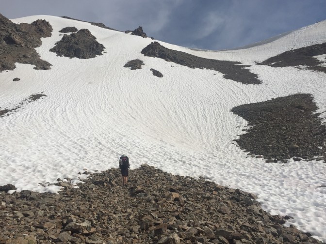 Lake Ann Pass with lingering cornice (the overhanging snow bank up on the saddle)