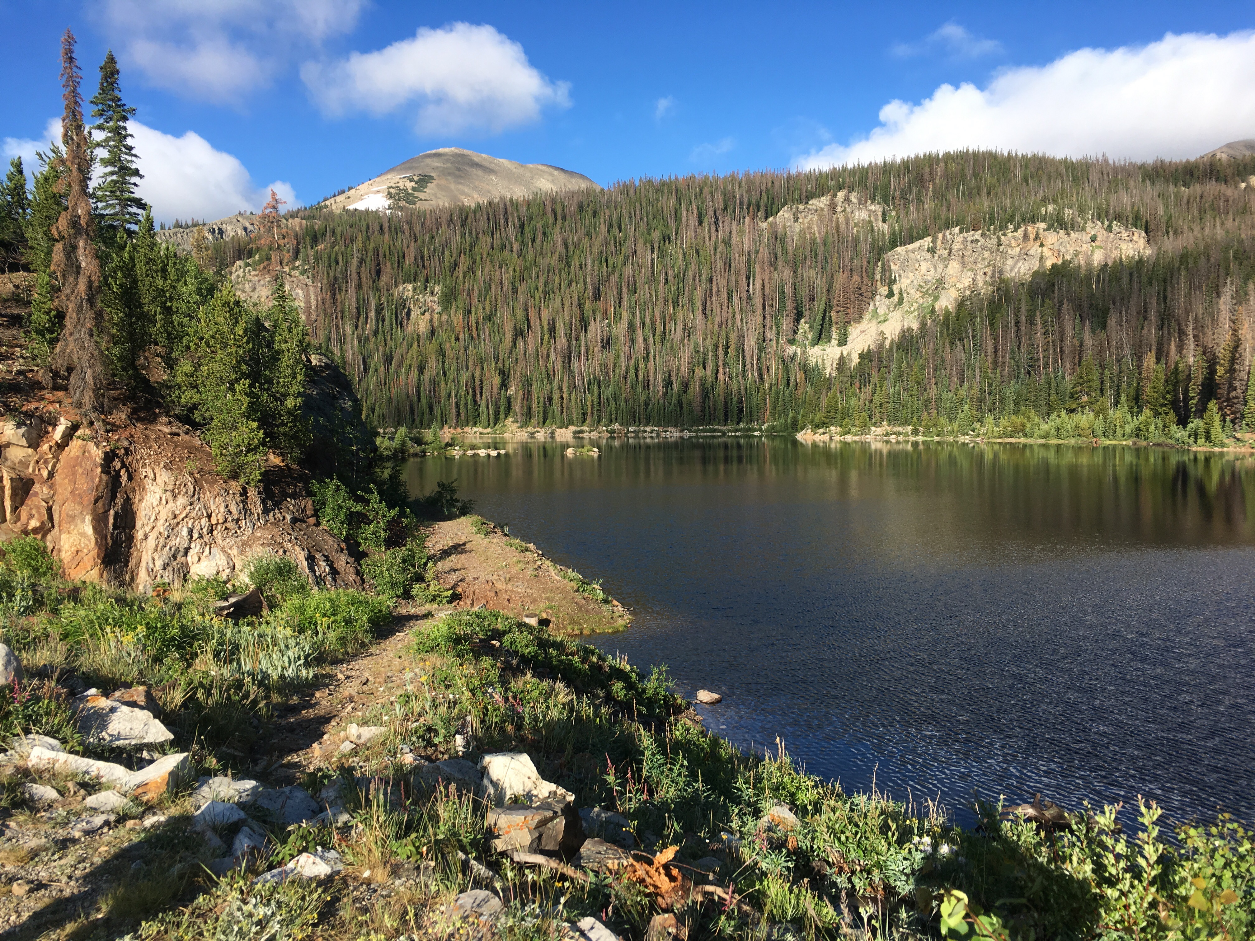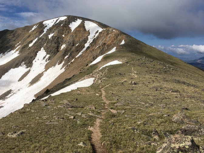 It’s only 11 miles to town and the promise of showers and laundry and dry everything. But of course the divide stands in between and here I am all soggy at the bottom. So on go the cold, wet clothes and soggy shoes, which warm up somewhat as I climb the steep hill, past lakes (Lakes!) until I am again walking right on the continental divide following a pleasantly crooked path past old looking stone cairns covered in lichens.