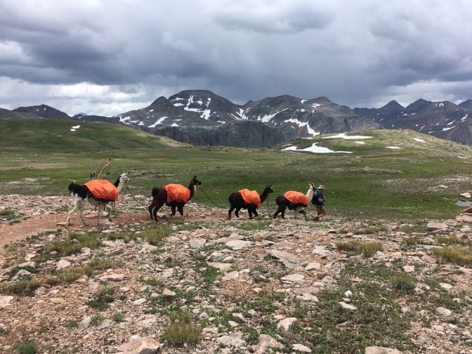 The puffy clouds are out and about, but still the difference compared to the same time yesterday is heartening. We take photos and marvel at how exposed we could have been had we walked into the storm yesterday. Then Arcade and I spy strange hoof prints in the mud. Too long for deer, too small for cows. Sheep? We guess. One ridge over and we catch a train of pack llamas a geared up for rain – how fun!