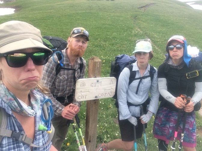 There are more high meadows with the most rugged peaks we have seen yet in the distance. And then we reach the junction. The one where, after 300 miles, the CT and the CDT arrows point on opposite directions. The junction where we have to part ways with Glimmer and Arcade. “May the thunderstorms stay off your ridges” I wish the couple. “And may you have dry feet” replies Glimmer.