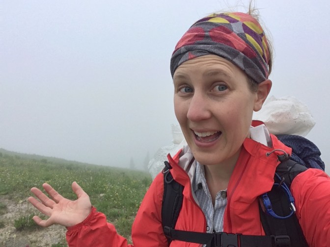 Most of the rest of the day is in the clouds and the rain, though bikers racing the entirely of the trail provide some distraction. The ones we see today are the stubborn stragglers, well behind the pack but determined to race against themselves. Otherwise it’s mostly viewless ridges and even foggier passes.