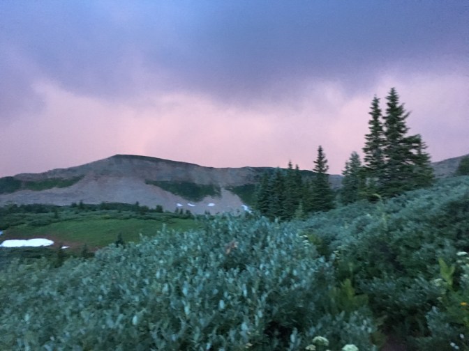 There’s a lake ahead that ends the waterless stretch, but it would make for a 30 mile day. I say I am going to camp sooner, alone with my grumpiness. But then each extra mile sets me up to finish tomorrow and be done with the wet feet and general struggles. And so a mile more turns in to three and then I am up near the tree line late in the day. The shifting clouds and the evening light make for a pleasingly moody landscape. With blue sky ahead after so much rain, I assume the storms are done for the day.