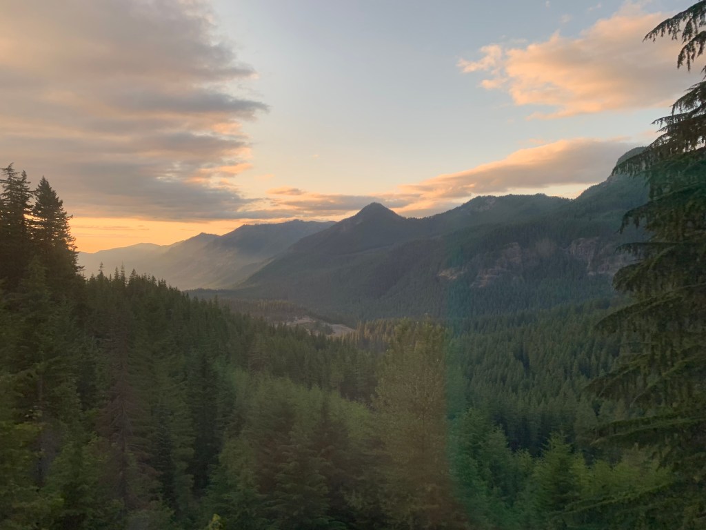I take train window-blurred photos of the forested mountains at sunset, the trail over the ridges just out of sight. Right now, the old reasons for skipping this stretch don’t seem to be enough. Why didn’t I just keep going? It was only a few days??? Regardless, I know my stubborn self well enough to understand that making it to Canada without connecting my steps will taint the finish, that I will deny myself some of the joy (also these Oregon miles are an appealingly flat reintroduction to the hiking life). So south I go on a slow train made slower by a broken down freight train blocking the tracks. South to walk north again so I can walk north some more. And maybe, one day, I will wake up truly content with all these new directions.