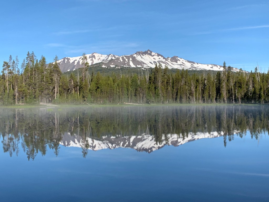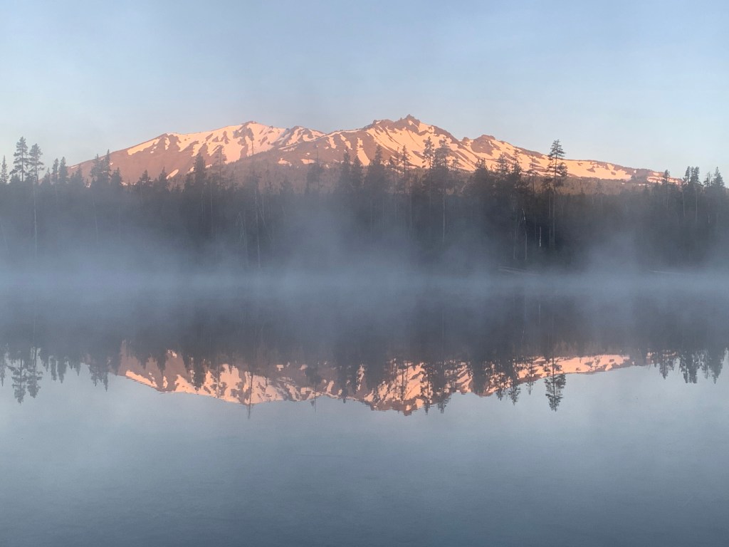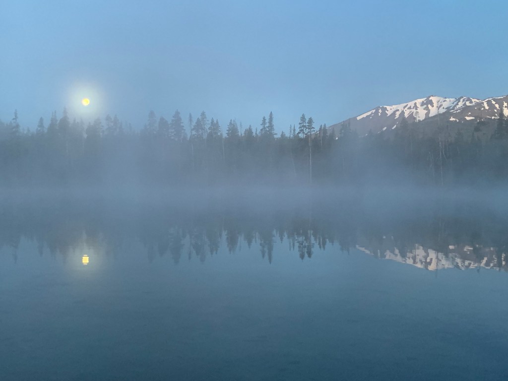 In the grey silence just before dawn, I poke my head out of the tent in search of sunrise. The nearly-full moon is still shining, setting behind the trees as morning mist rises from the still waters. I watch the mountains as they brighten, briefly blush pink, before the mist-quelling warm bright of day is my signal to head out.