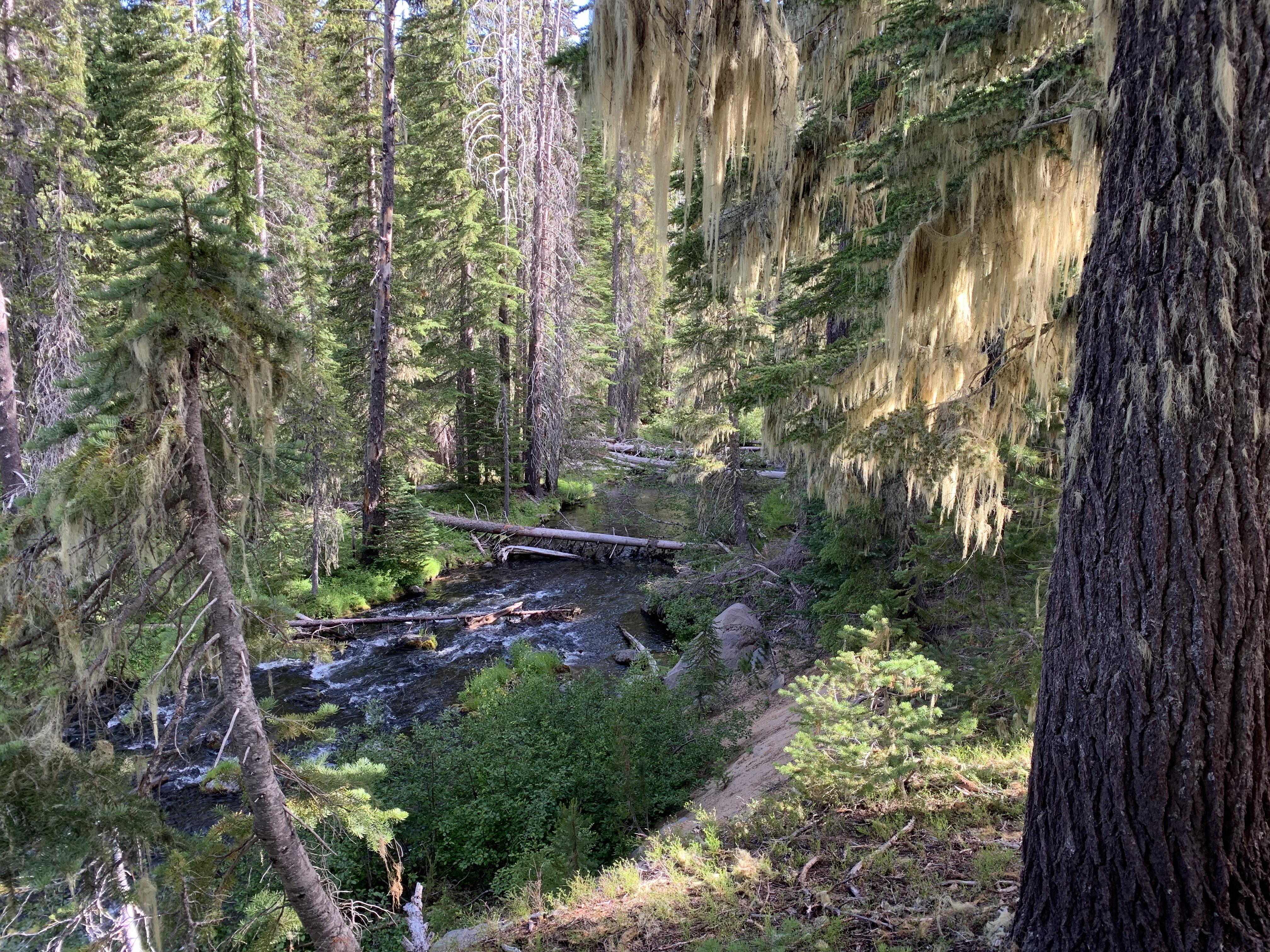 Trapper creek is a lush contrast to yesterday’s dust. The trees are thickly draped with lichen, glowing golden in the early sun. The rushing crystal waters are faintly tinted with aqua, gathering momentum on the gentle but insistent descent toward Odell Lake. Why am I still so surprised by the stark contrast from dusty, arid rain shadows to wet, shady exposures?